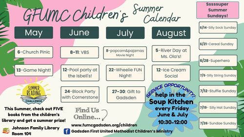 At Gadsden First, we believe in teaching our children as early as possible the good news of the gospel, how to pray & read their Bibles, and to love Jesus. We also believe that children should have fun as they learn! Therefore, during Children's Church (9:00 am & 11:00 am), Sunday School (10:00 am) and Wednesday Nights (6:00 pm), we plan lessons that are hands-on, engaging and age-appropriate for children ages 3 to 5th grade. Prayers are either led by the children or the children pray along with their teacher. We encourage our children to interact with their Bible by looking up the story of the day and then taking turns reading it. To make the story come alive, the teachers lead the children in drama, games, and/or crafts that coordinate with the lesson.